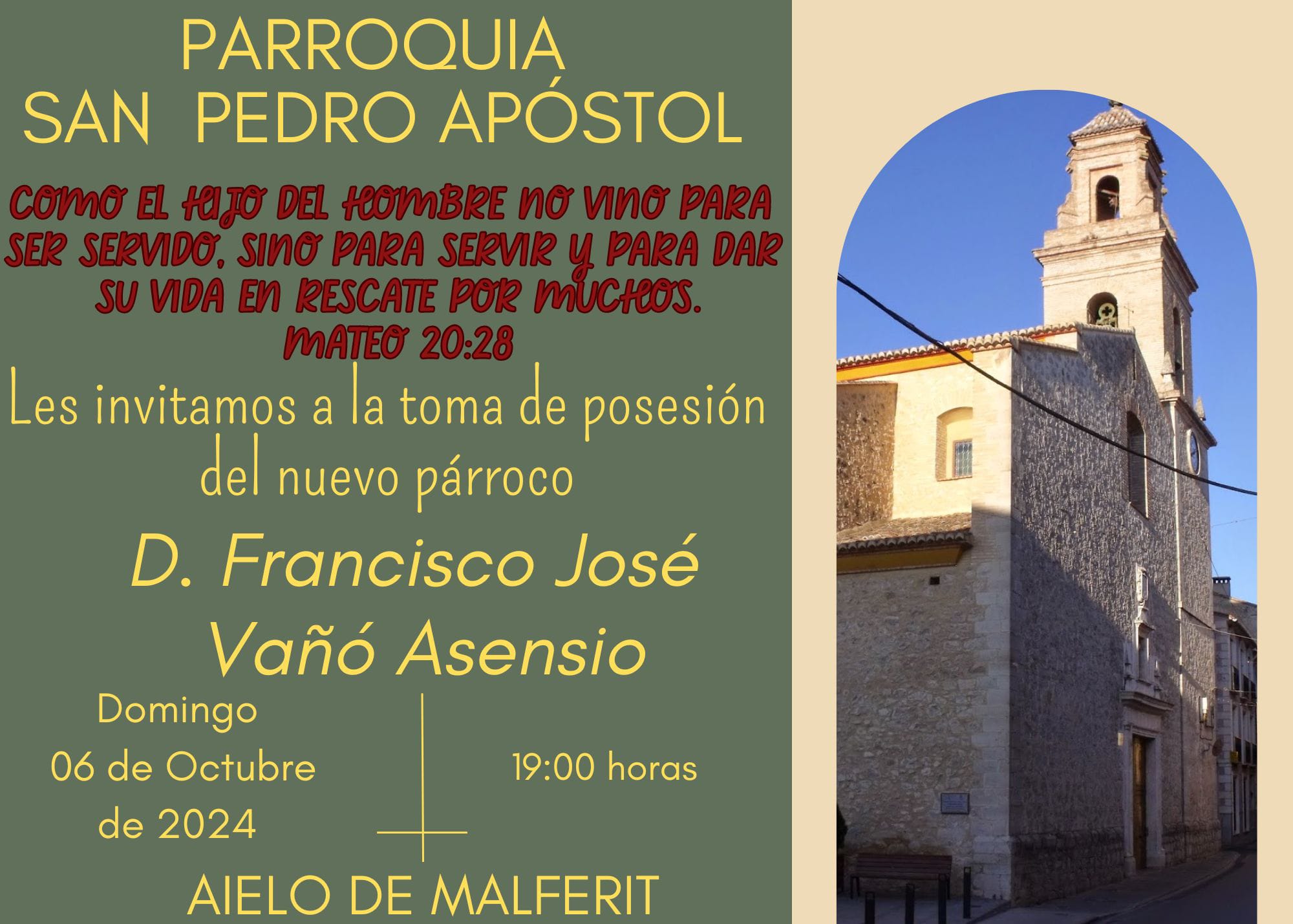 El Consell Pastoral de la Parròquia Sant Pere Apòstol d’Aielo de Malferit convida a tota la població a participar a l’Eucaristia de Benvinguda del que serà el nou retor D. Francisco Vañó Asensio.