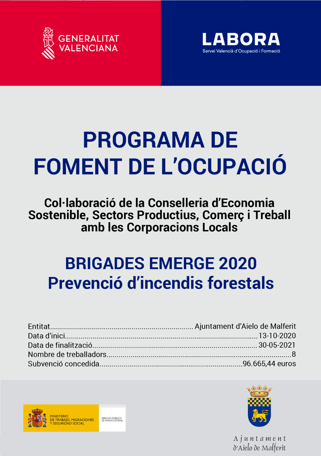 Les 2 brigades estan formades per 3 peons i un capatàs, sent un total de 8 persones contractades gràcies a una subvenció concedida a l’Ajuntament d’Aielo de Malferit pel Servei Valencià d’Ocupació i Formació (Labora) amb un import de 94.665,44 €.