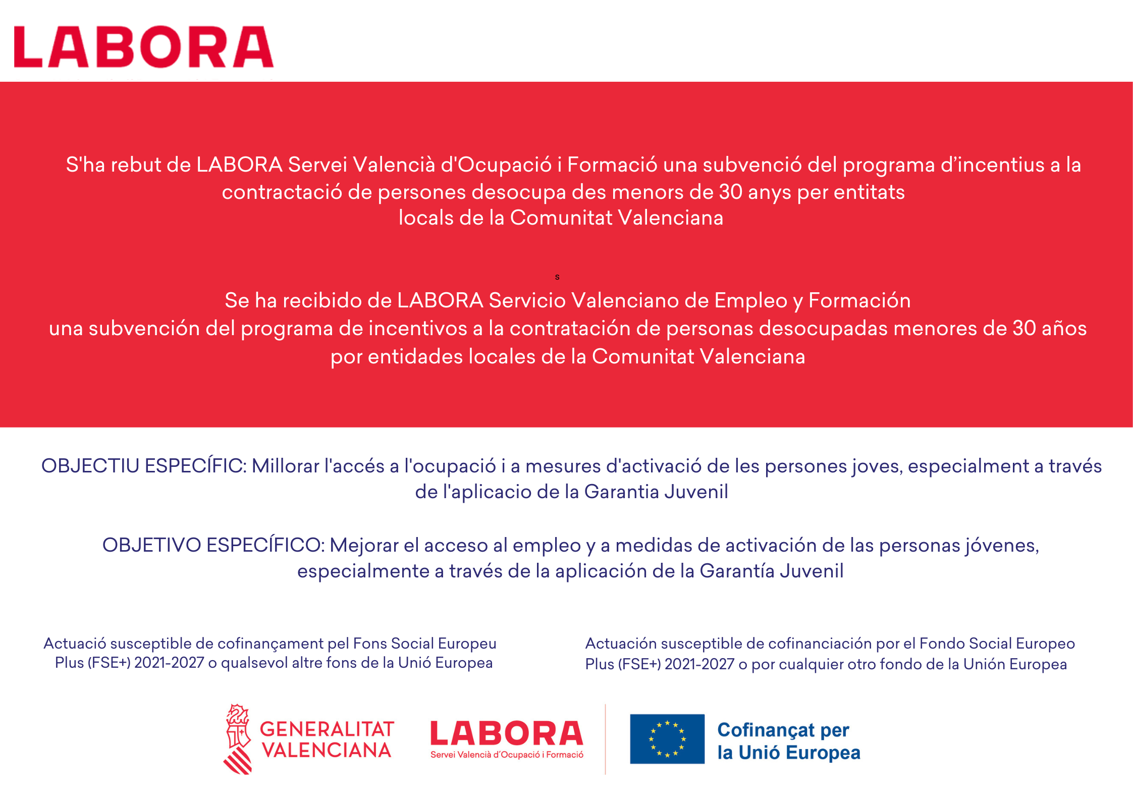 La subvenció d’aquest programa ha estat de 51.942,54 €, subvenció rebuda de Labora, Servei Valencià d’Ocupació i Formació, provinent del Fons Social Europeu FSE+.