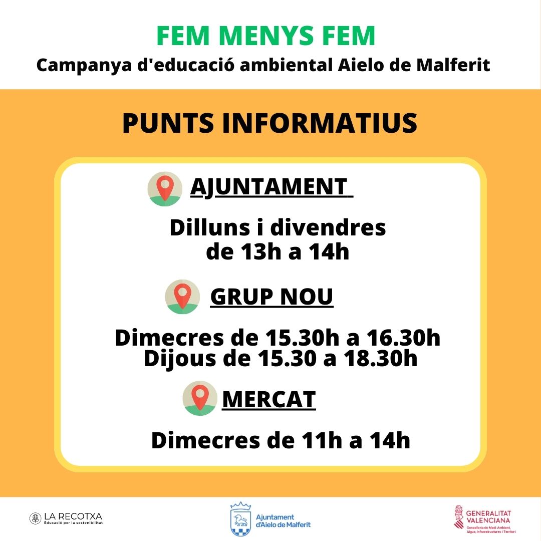 Per a resoldre els dubtes de la ciutadania sobre prevenció, separació i gestió de residus, s'establiran punts informatius tant a l’ajuntament com a l’EPA (Grup nou), i el mercat amb estos horaris:
