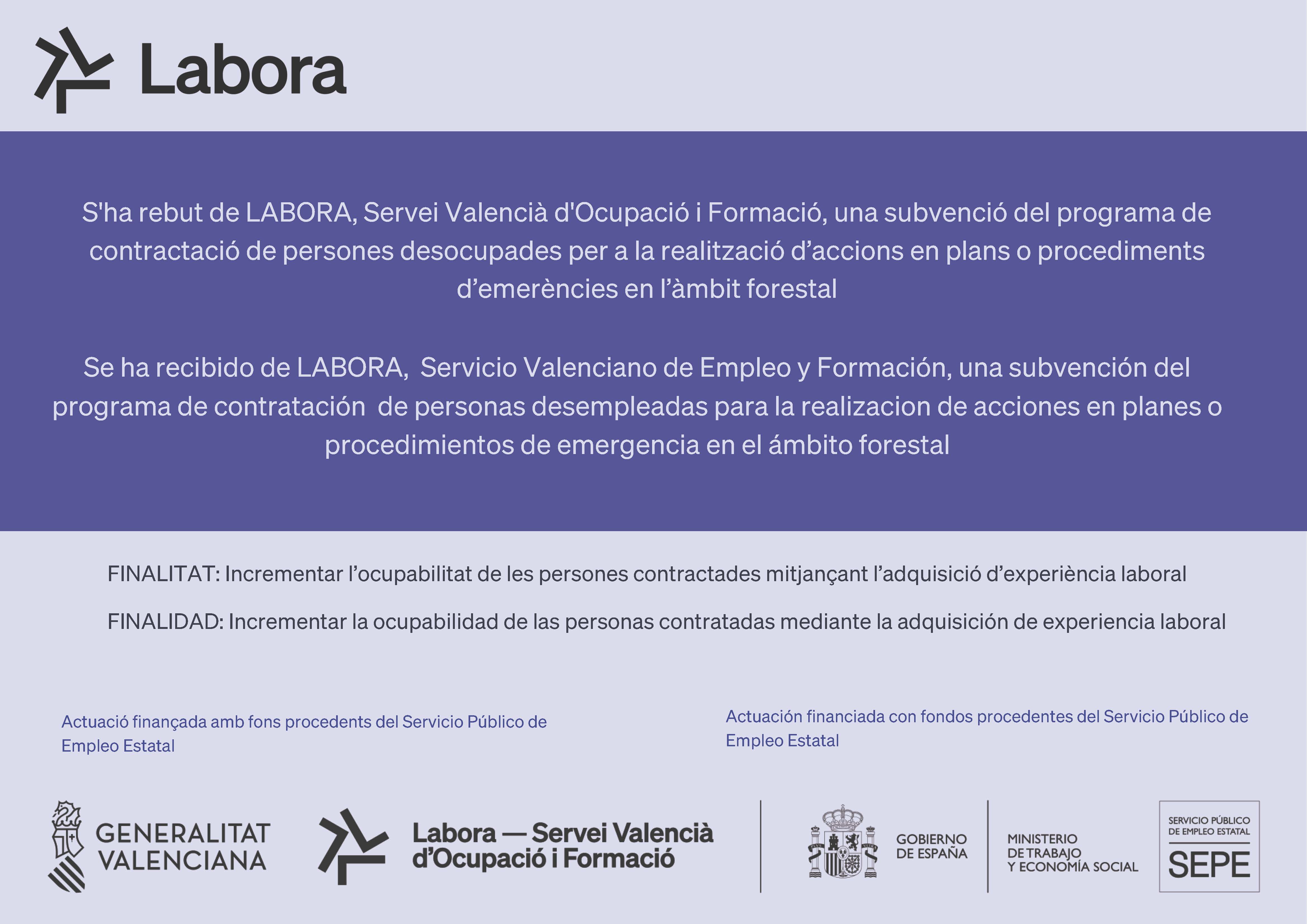 Este projecte està finançat amb fons procedents del Servei Públic d’Ocupació Estatal i te com a objecte concedir subvencions adreçades a contractar persones desocupades per les entitats locals, amb la finalitat que incrementen la seua ocupabilitat mitjançant l’adquisició d’experiència laboral, fent actuacions que tinguen com a objecte principal mitigar un risc contemplat en un pla o procediment d’emergències de la Comunitat Valenciana en el conjunt o d’àmbit local, i reduint en particular els riscos poblacionals derivats dels incendis forestals.